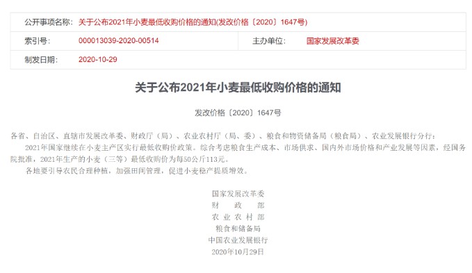 關(guān)于2021年小麥最低收購價有關(guān)政策的通知各省、自治區(qū)、直轄市發(fā)展改革委、糧食和物資儲備局(糧食局)、財政廳(局)、農(nóng)業(yè)農(nóng)村廳(局、委)、農(nóng)業(yè)發(fā)展銀行分行,中國儲備糧管理集團有限公司、中糧集團有限公司、中國供銷集團有限公司、中國中化集團有限公司:為保障國家糧食安全,進一步完善糧食最低收購價政策,2021年繼續(xù)對最低收購價小麥限定收購總量?,F(xiàn)將具體事項通知如下。根據(jù)近幾年小麥最低收購價收購數(shù)量,限定2021年最低收購價小麥收購總量為3700萬噸。(一)分批下達。限定收購總量分兩批次下達,第一批數(shù)量為3330萬噸,不分配到?。坏诙鷶?shù)量為370萬噸,視收購需要具體分配到省。當最低收購價全國收購總量達到第一批數(shù)量的90%時,中儲糧有關(guān)分公司應(yīng)會同省級糧食等部門單位及時提出本省第二批收購的計劃數(shù)量建議。中儲糧集團公司根據(jù)當年小麥產(chǎn)量、收購量、農(nóng)戶余糧和市場價格等情況統(tǒng)籌平衡各省數(shù)量后,報國家糧食和物資儲備局批準。國家糧食和物資儲備局通過政府網(wǎng)站公布各省第二批收購數(shù)量。在第一批收購?fù)瓿珊?,有關(guān)省份按照批準的第二批數(shù)量繼續(xù)開展收購。當收購量達到本省批準數(shù)量時,立即停止該省最低收購價收購且不再啟動。(二)動態(tài)監(jiān)測。啟動最低收購價執(zhí)行預(yù)案后,中儲糧集團公司要嚴格按照預(yù)案有關(guān)規(guī)定,加強統(tǒng)計監(jiān)測,每五日向國家糧食和物資儲備局報送收購進度;啟動第二批收購后,中儲糧集團公司要按日報送收購進度。國家糧食和物資儲備局定期通過政府網(wǎng)站公布最低收購價全國收購總量。省級糧食等有關(guān)部門要結(jié)合小麥商品量和農(nóng)戶余糧情況,及時開展調(diào)研調(diào)度,全面掌握收糧進度。(一)認真落實限量收購政策。中儲糧集團公司作為最低收購價政策執(zhí)行主體,要嚴格執(zhí)行限定收購總量的收購政策,不得超量收購。財政資金支持限于最低收購價政策下的最高收購總量內(nèi)。(二)加強市場監(jiān)管。各地要認真落實糧食收儲制度改革精神,規(guī)范糧食流通市場秩序,依法依規(guī)嚴厲查處糧食收儲過程中的違法違規(guī)行為。(三)促進“優(yōu)糧優(yōu)價”。各地要積極鼓勵農(nóng)企對接,充分發(fā)揮市場價格對生產(chǎn)的反饋引導(dǎo)作用,促進種植結(jié)構(gòu)調(diào)整優(yōu)化,增加綠色優(yōu)質(zhì)安全產(chǎn)品供給。