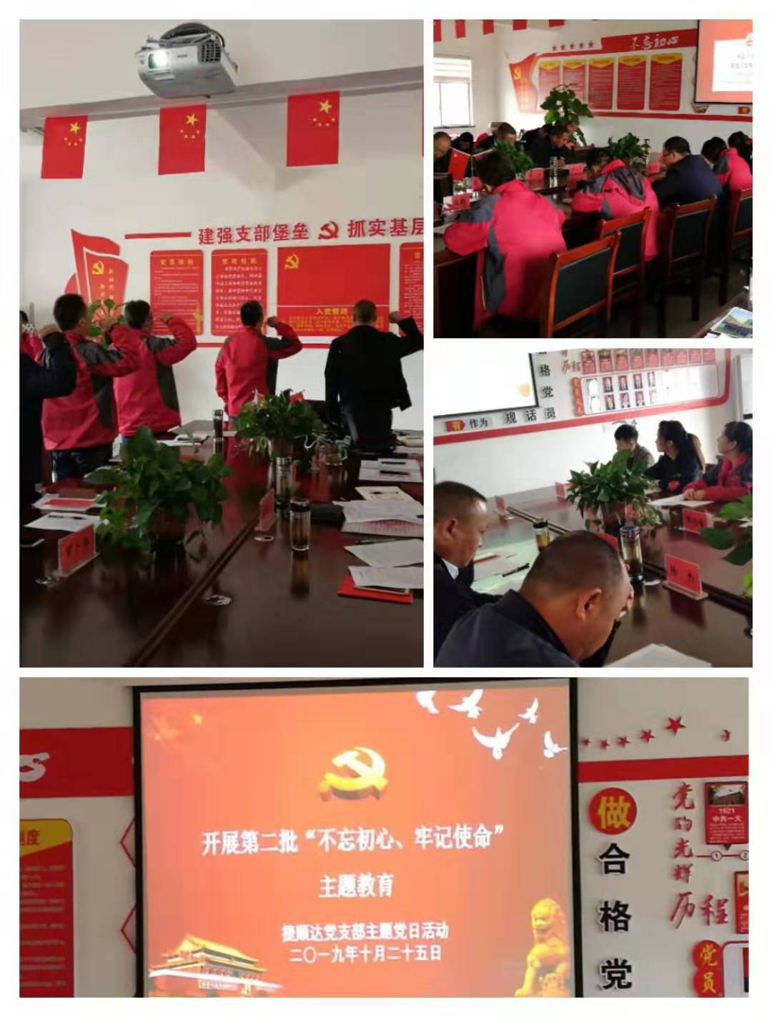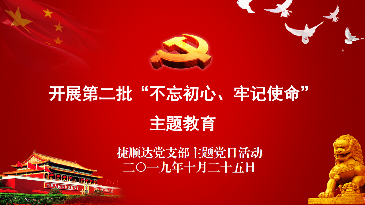 2019年10月25日下午14:30捷順達黨支部召開了本月黨建會:開展第二批“不忘初心,牢記使命”主題教育;本次會議共有4大項;1、回顧初心 2、黨性教育 3、民主議事 4、實踐鍛煉