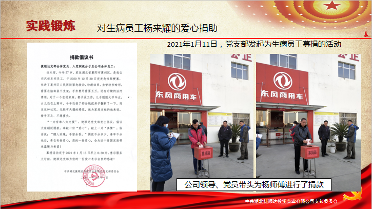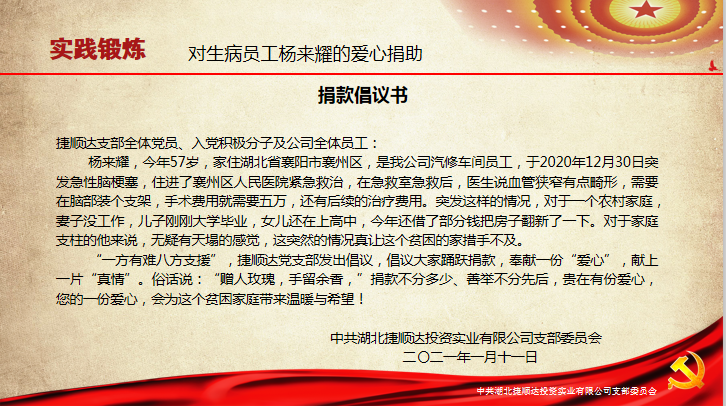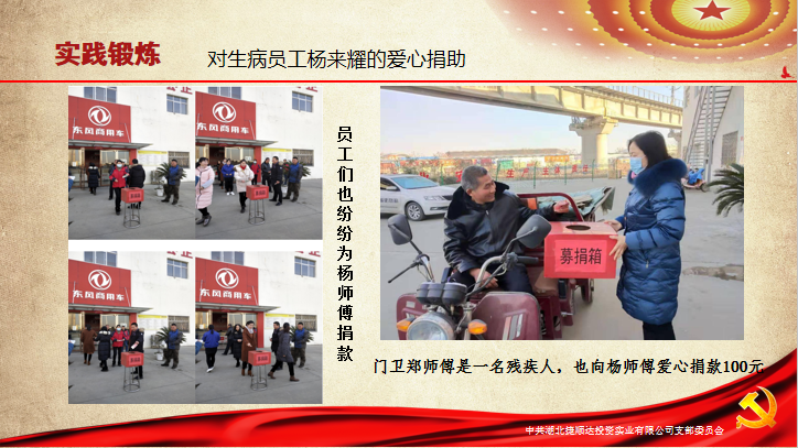 黨支部倡議為生病員工楊來(lái)耀捐款,黨員同志們積極發(fā)揮模范帶頭作用,紛紛為生病員工伸出援手,員工們也積極響應(yīng),捐款共計(jì)5270元。