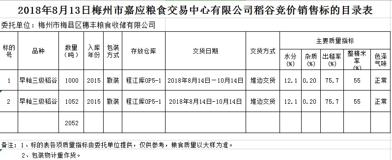 受客戶(hù)委托,梅州市嘉應(yīng)糧食交易中心有限公司定于2018年8月13日(星期一)舉辦糧食競(jìng)價(jià)交易會(huì),梅州市梅縣區(qū)穗豐糧食收儲(chǔ)有限公司擬銷(xiāo)售2015年早秈稻2052噸。