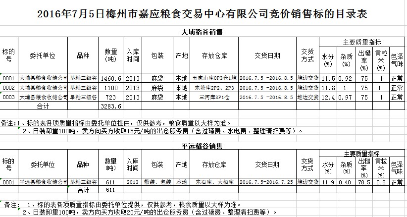 受客戶委托,梅州市嘉應(yīng)糧食交易中心有限公司定于2016年7月5日舉辦糧食競價交易會,大埔縣糧食收儲公司擬銷售2013年早秈稻谷3283.6噸,平遠縣糧食收儲公司擬銷售2013年早秈稻谷611噸。