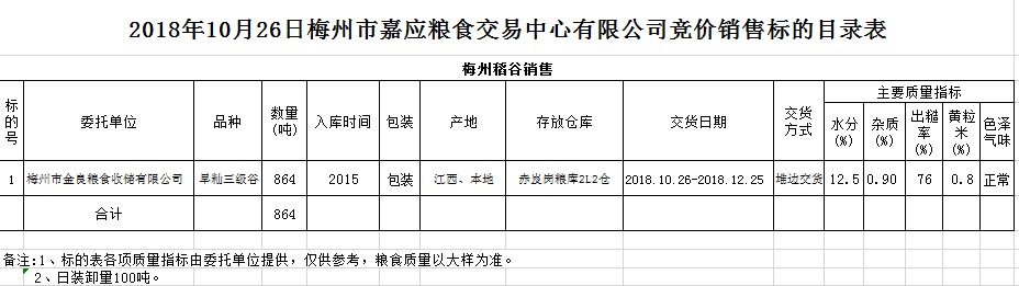 交易時間和地點:2018年10月26日(星期五)上午10時15分。廣東省梅州市彬芳大道南161號梅州市糧食交易中心3樓。