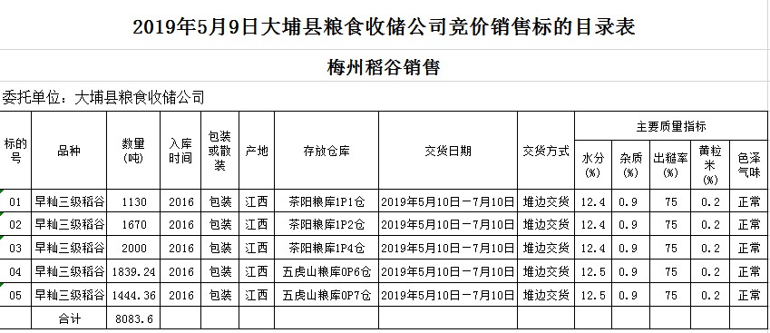 受客戶委托,梅州市嘉應(yīng)糧食交易中心有限公司定于2019年5月9日(星期四)舉辦糧食競(jìng)價(jià)交易會(huì),大埔縣糧食收儲(chǔ)公司擬銷售2016年早秈稻8083.6噸。