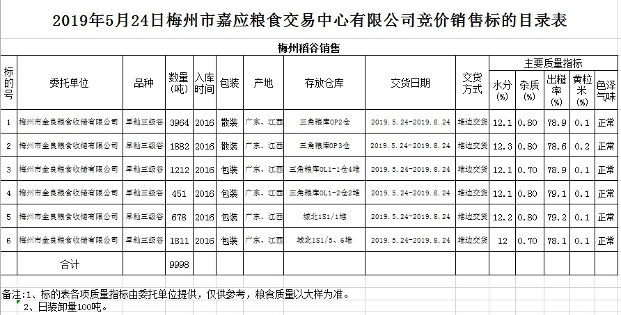 交易時間和地點:2019年5月24日(星期五)上午10時10分。廣東省梅州市彬芳大道南161號梅州市糧食交易中心3樓。