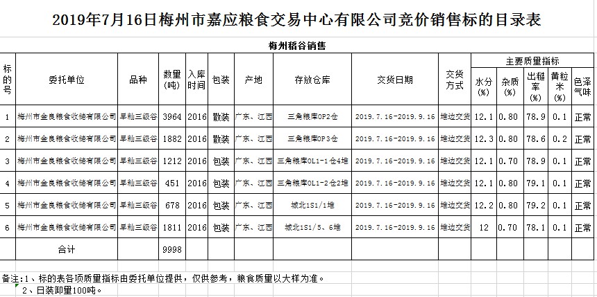 受客戶委托,梅州市嘉應(yīng)糧食交易中心有限公司定于2019年7月16日(星期二)舉辦糧食競(jìng)價(jià)交易會(huì),梅州市金良糧食收儲(chǔ)有限公司擬銷售早秈稻9998噸。
