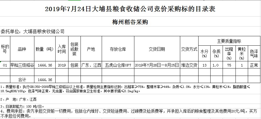 交易時(shí)間和地點(diǎn):2019年7月24日(星期三)上午10時(shí)。廣東省梅州市彬芳大道南161號(hào)梅州市糧食交易中心3樓。