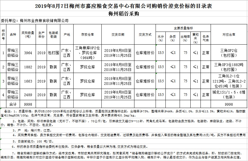 受客戶委托,梅州市嘉應(yīng)糧食交易中心有限公司定于2019年8月7日(星期三)舉辦稻谷購(gòu)銷價(jià)差聯(lián)動(dòng)標(biāo)的交易會(huì),梅州市金良糧食收儲(chǔ)有限公司擬銷售和采購(gòu)早秈稻9998噸。