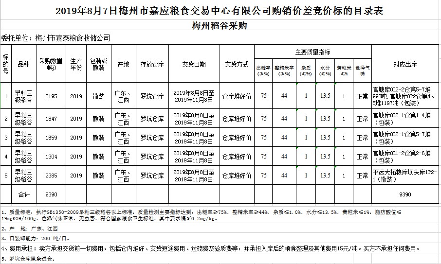 受客戶委托,梅州市嘉應(yīng)糧食交易中心有限公司定于2019年8月7日(星期三)舉辦稻谷購(gòu)銷價(jià)差聯(lián)動(dòng)標(biāo)的交易會(huì),梅州市嘉泰糧食收儲(chǔ)公司擬銷售和采購(gòu)早秈稻9390噸。