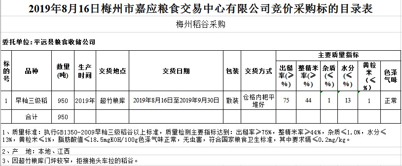受客戶委托,梅州市嘉應(yīng)糧食交易中心有限公司定于2019年8月16日(星期五)舉辦糧食競(jìng)價(jià)交易會(huì),平遠(yuǎn)縣糧食收儲(chǔ)公司擬采購(gòu)2019年早秈稻950噸。