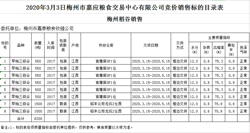 受客戶委托,梅州市嘉應(yīng)糧食交易中心有限公司定于2020年3月3日(星期二)舉辦糧食競(jìng)價(jià)交易會(huì),梅州市嘉泰糧食收儲(chǔ)公司擬銷(xiāo)售2017年早秈稻6200噸。
