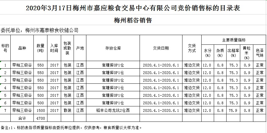 受客戶委托,梅州市嘉應(yīng)糧食交易中心有限公司定于2020年3月17日(星期二)舉辦糧食競(jìng)價(jià)交易會(huì),梅州市嘉泰糧食收儲(chǔ)公司擬銷售2017年早秈稻4700噸。