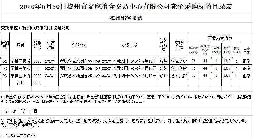 受客戶(hù)委托,梅州市嘉應(yīng)糧食交易中心有限公司定于2020年6月30日(星期二)舉辦糧食競(jìng)價(jià)交易會(huì),梅州市嘉泰糧食收儲(chǔ)公司擬采購(gòu)2020年早秈稻8773噸。