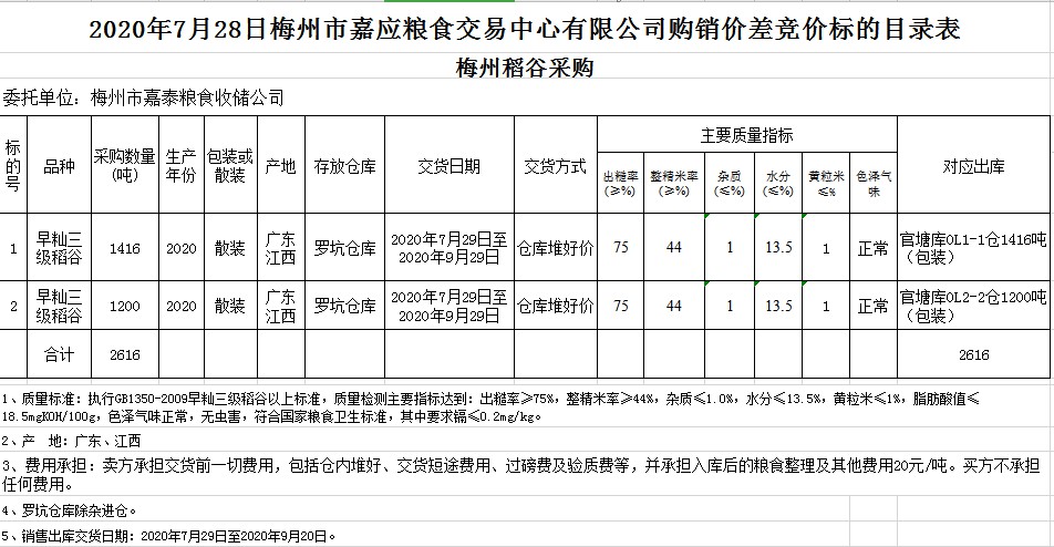 受客戶委托,梅州市嘉應(yīng)糧食交易中心有限公司定于2020年7月28日(星期二)舉辦稻谷購(gòu)銷價(jià)差聯(lián)動(dòng)標(biāo)的交易會(huì),梅州市嘉泰糧食收儲(chǔ)公司擬銷售和采購(gòu)早秈稻2616噸。