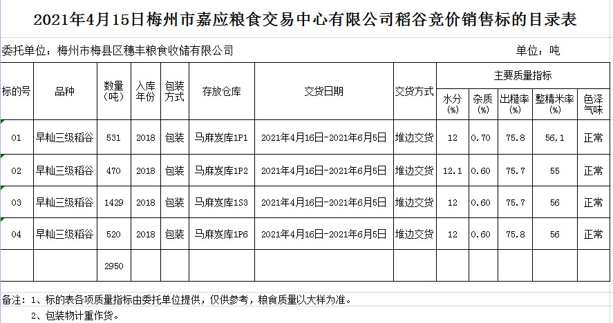 受客戶委托,梅州市嘉應(yīng)糧食交易中心有限公司定于2021年4月15日(星期四)舉辦糧食競價(jià)交易會。梅州市梅縣區(qū)穗豐糧食收儲有限公司擬銷售2018年早秈稻2950噸。