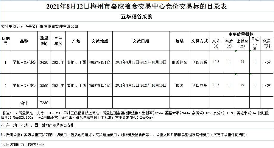 受客戶委托,梅州市嘉應(yīng)糧食交易中心有限公司定于2021年8月12日(星期四)舉辦糧食競價(jià)交易會。五華縣琴江糧油收儲管理有限公司擬采購2021年早秈稻7280噸。
