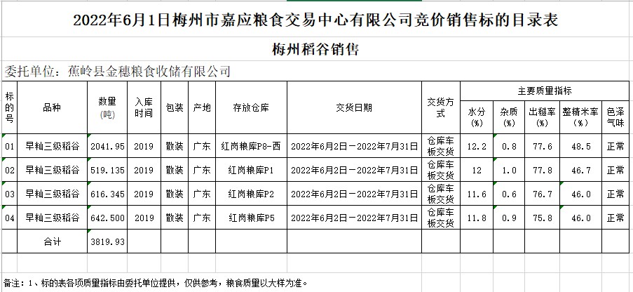 2022年6月1日蕉嶺縣金穗糧食收儲(chǔ)有限公司稻谷銷售