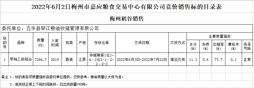 受客戶委托,梅州市嘉應糧食交易中心有限公司定于2022年6月2日(星期四)舉辦糧食競價交易會。五華縣琴江糧油收儲管理有限公司擬銷售2019年早秈稻7286.7噸。