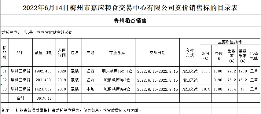 受客戶委托,梅州市嘉應(yīng)糧食交易中心有限公司定于2022年6月14日(星期二)舉辦糧食競(jìng)價(jià)交易會(huì)。平遠(yuǎn)縣平糧糧食收儲(chǔ)有限公司擬銷(xiāo)售2019、2020年早秈稻3619.43噸。