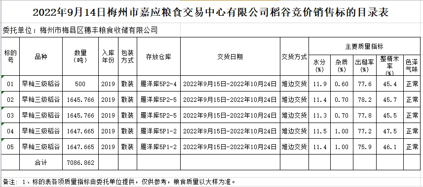 受客戶委托,梅州市嘉應(yīng)糧食交易中心有限公司定于2022年9月14日(星期三)舉辦糧食競價(jià)交易會(huì)。梅州市梅縣區(qū)穗豐糧食收儲(chǔ)有限公司擬銷售2019年早秈稻7086.862噸。