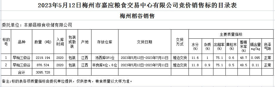 受客戶委托,梅州市嘉應(yīng)糧食交易中心有限公司定于2023年5月12日(星期五)舉辦糧食競價(jià)交易會。豐順縣糧食收儲有限公司擬銷售2020年早秈稻3095.728噸。
