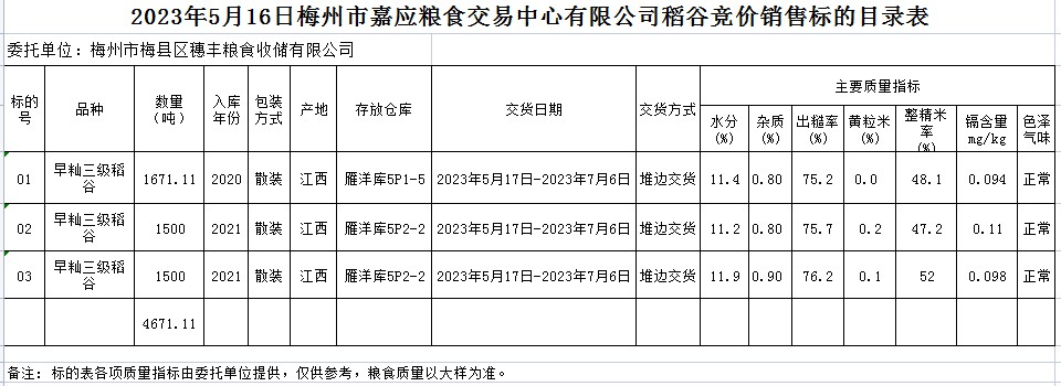 受客戶委托,梅州市嘉應糧食交易中心有限公司定于2023年5月16日(星期二)舉辦糧食競價交易會。梅州市梅縣區(qū)穗豐糧食收儲有限公司擬銷售2020、2021年早秈稻4671.11噸。