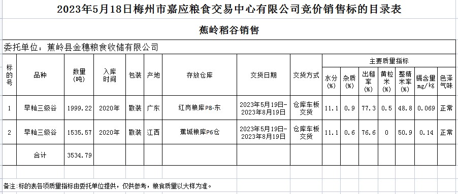 受客戶委托,梅州市嘉應(yīng)糧食交易中心有限公司定于2023年5月18日(星期四)舉辦糧食競價交易會。蕉嶺縣金穗糧食收儲有限公司擬銷售2020年早秈稻3534.79噸。