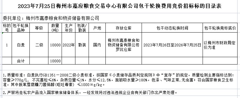 二級(jí)小麥10000噸,總價(jià)款32577858.44元。包干輪換期限為3年,即從2023年7月26日至2026年7月25日。