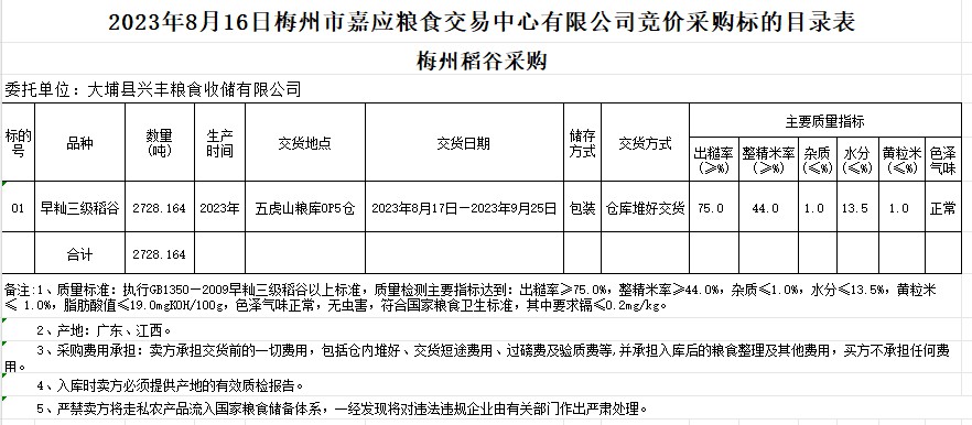 受客戶委托,梅州市嘉應糧食交易中心有限公司定于2023年8月16日(星期三)舉辦糧食競價交易會。大埔縣興豐糧食收儲有限公司擬采購2023年早秈稻2728.164噸。