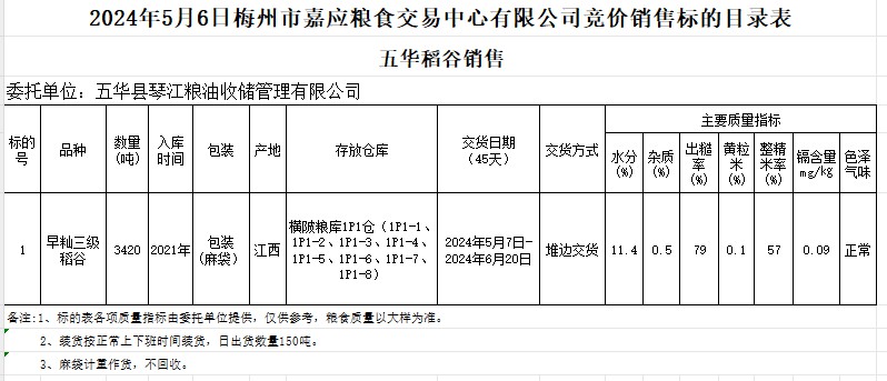 受客戶委托,梅州市嘉應(yīng)糧食交易中心有限公司定于2024年5月6日(星期一)舉辦糧食競價交易會。五華縣琴江糧油收儲管理有限公司擬銷售2021年產(chǎn)早秈稻3420噸。