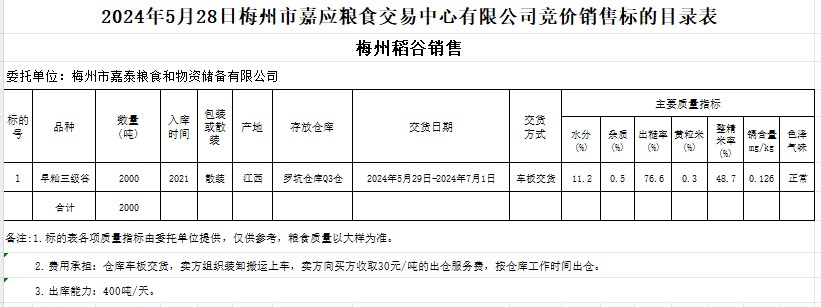 受客戶委托,梅州市嘉應(yīng)糧食交易中心有限公司定于2024年5月28日(星期二)舉辦糧食競價(jià)交易會。梅州市嘉泰糧食和物資儲備有限公司擬銷售2021年產(chǎn)早秈稻2000噸。