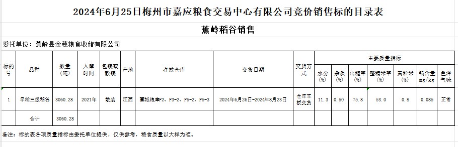 受客戶(hù)委托,梅州市嘉應(yīng)糧食交易中心有限公司定于2024年6月25日(星期二)舉辦糧食競(jìng)價(jià)交易會(huì)。蕉嶺縣金穗糧食收儲(chǔ)有限公司擬銷(xiāo)售2021年產(chǎn)早秈稻谷3060.28噸。
