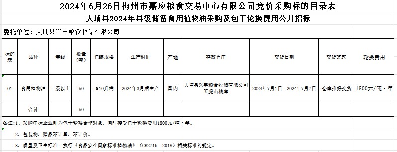 受大埔縣興豐糧食收儲有限公司委托,梅州市嘉應(yīng)糧食交易中心有限公司定于2024年6月26日(星期三)上午10時在廣東省梅州市彬芳大道南161號梅州市糧食交易中心3樓,舉辦大埔縣2024年縣級儲備食用植物油采購及包干輪換費用公開招標。