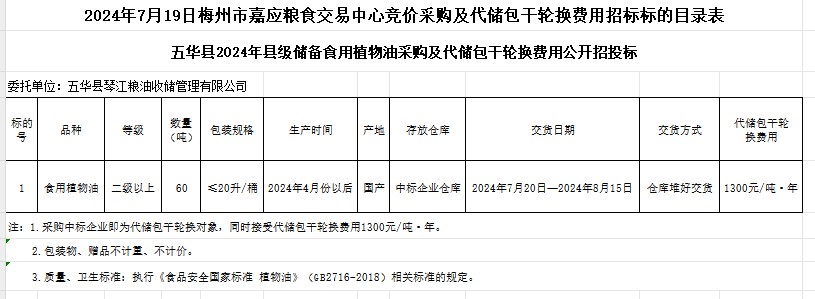 五華縣2024年縣級(jí)儲(chǔ)備食用植物油采購(gòu)及代儲(chǔ)包干輪換費(fèi)用公開招投標(biāo)公告