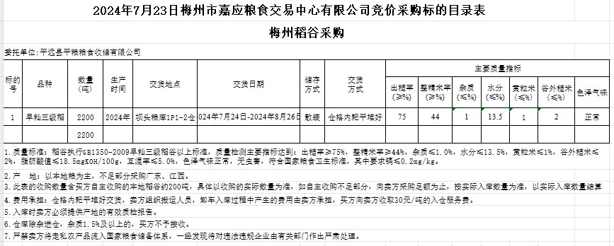 受客戶委托,梅州市嘉應(yīng)糧食交易中心有限公司定于2024年7月23日(星期二)舉辦糧食競價交易會。平遠縣平糧糧食收儲有限公司擬采購2024年產(chǎn)早秈稻谷2200噸。