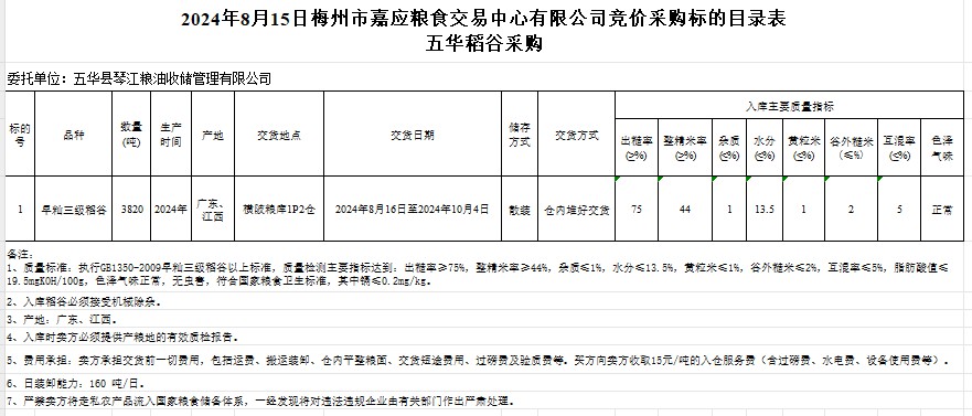 受客戶(hù)委托,梅州市嘉應(yīng)糧食交易中心有限公司定于2024年8月15日(星期四)舉辦糧食競(jìng)價(jià)交易會(huì)。五華縣琴江糧油收儲(chǔ)管理有限公司擬采購(gòu)2024年產(chǎn)早秈稻谷3820噸。