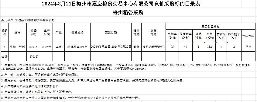 受客戶委托,梅州市嘉應(yīng)糧食交易中心有限公司定于2024年8月21日(星期三)舉辦糧食競(jìng)價(jià)交易會(huì)。平遠(yuǎn)縣平糧糧食收儲(chǔ)有限公司擬采購(gòu)2024年產(chǎn)早秈稻870.57噸。