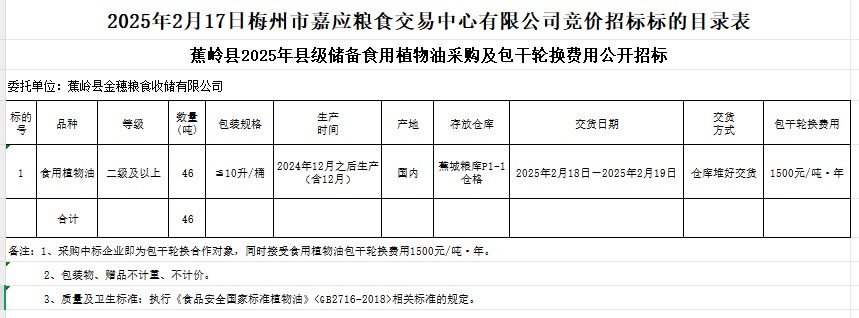 蕉嶺縣2025年縣級儲備食用植物油采購及包干輪換費用公開招標公告
