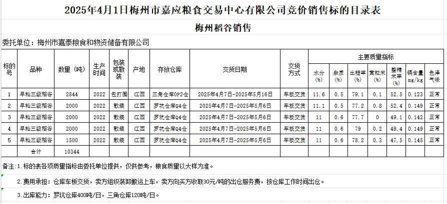 受客戶委托,梅州市嘉應糧食交易中心有限公司定于2025年4月1日(星期二)舉辦糧食競價交易會。梅州市嘉泰糧食和物資儲備有限公司擬銷售2022年產(chǎn)早秈稻谷10344噸。