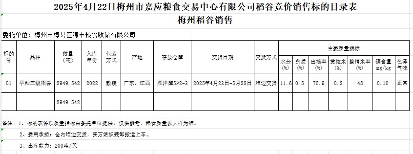 受客戶委托,梅州市嘉應(yīng)糧食交易中心有限公司定于2025年4月22日(星期二)舉辦糧食競(jìng)價(jià)交易會(huì)。梅州市梅縣區(qū)穗豐糧食收儲(chǔ)有限公司擬銷售2022年產(chǎn)早秈稻谷2949.542噸。
