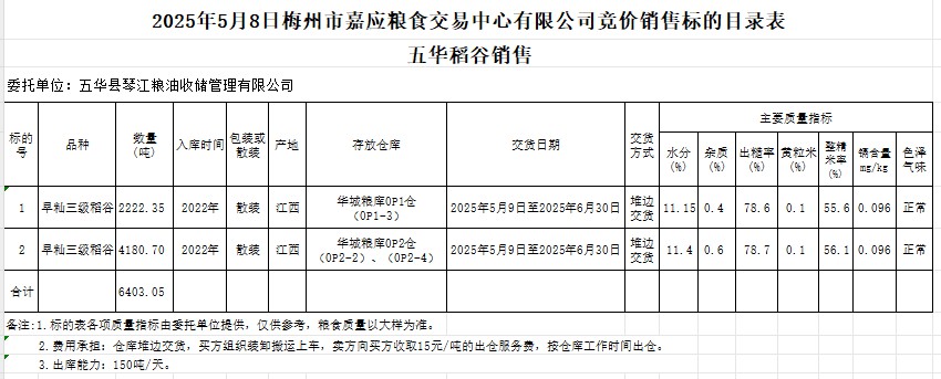 受客戶委托,梅州市嘉應(yīng)糧食交易中心有限公司定于2025年5月8日(星期四)舉辦糧食競(jìng)價(jià)交易會(huì)。五華縣琴江糧油收儲(chǔ)管理有限公司擬銷售2022年產(chǎn)早秈稻谷6403.05噸。