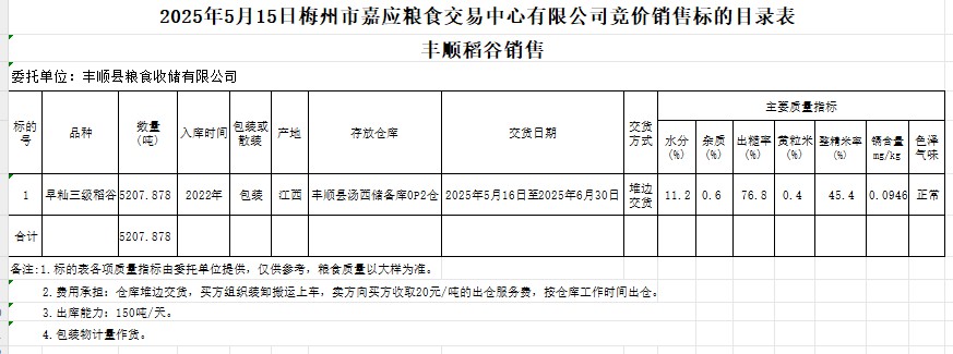 受客戶委托,梅州市嘉應(yīng)糧食交易中心有限公司定于2025年5月15日(星期四)舉辦糧食競價(jià)交易會(huì)。豐順縣糧食收儲(chǔ)有限公司擬銷售2022年產(chǎn)早秈稻谷5207.878噸。