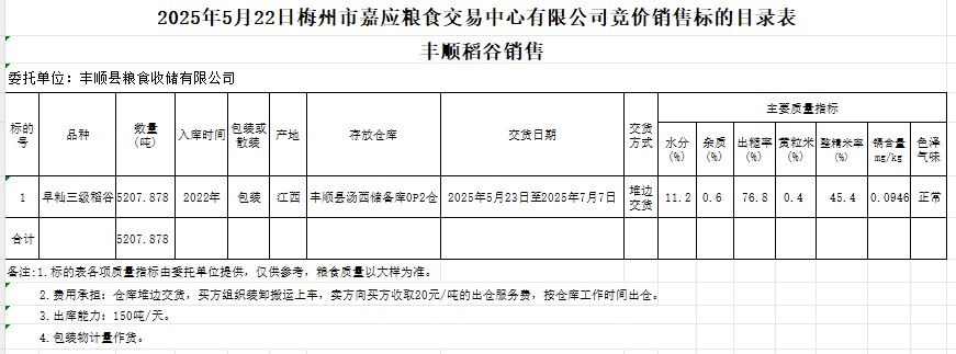 受客戶委托,梅州市嘉應(yīng)糧食交易中心有限公司定于2025年5月22日(星期四)舉辦糧食競價交易會。豐順縣糧食收儲有限公司擬銷售2022年產(chǎn)早秈稻谷5207.878噸。