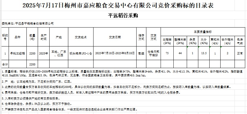 受客戶(hù)委托,梅州市嘉應(yīng)糧食交易中心有限公司定于2025年7月17日(星期四)舉辦糧食競(jìng)價(jià)交易會(huì)。平遠(yuǎn)縣平糧糧食收儲(chǔ)有限公司擬采購(gòu)2025年產(chǎn)早秈稻谷2200噸。