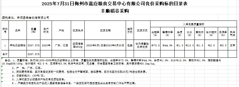 受客戶委托,梅州市嘉應(yīng)糧食交易中心有限公司定于2025年7月31日(星期四)舉辦糧食競價(jià)交易會(huì)。豐順縣糧食收儲(chǔ)有限公司擬采購2025年產(chǎn)早秈稻谷5207.878噸。