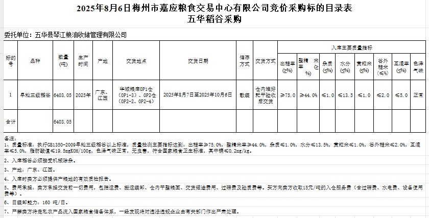 受客戶委托,梅州市嘉應(yīng)糧食交易中心有限公司定于2025年8月6日(星期三)舉辦糧食競(jìng)價(jià)交易會(huì)。五華縣琴江糧油收儲(chǔ)管理有限公司擬采購(gòu)2025年產(chǎn)早秈稻谷6403.05噸。