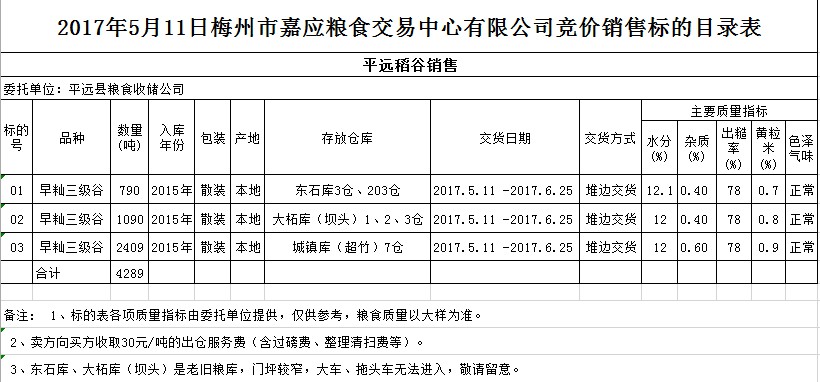 受客戶委托,梅州市嘉應(yīng)糧食交易中心有限公司定于2017年5月11日舉辦糧食競(jìng)價(jià)交易會(huì),平遠(yuǎn)縣糧食收儲(chǔ)公司擬銷售2015年早秈三級(jí)稻谷4289噸。