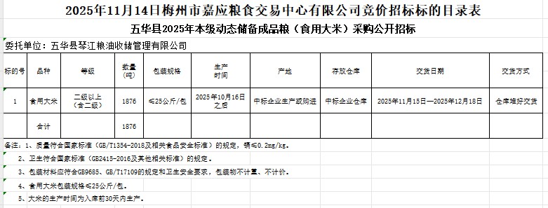 五華縣2025年本級(jí)動(dòng)態(tài)儲(chǔ)備成品糧(食用大米)采購及代儲(chǔ)包干輪換費(fèi)用公開招標(biāo)公告