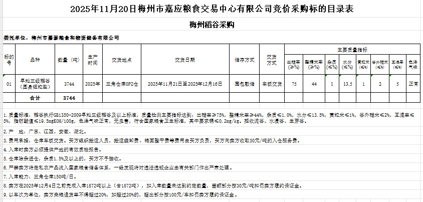 受客戶委托,梅州市嘉應(yīng)糧食交易中心有限公司定于2025年11月20日(星期四)舉辦糧食競價交易會。梅州市嘉泰糧食和物資儲備有限公司擬采購2025年產(chǎn)早秈稻谷3744噸。