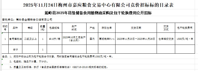 受蕉嶺縣金穗糧食收儲(chǔ)有限公司委托,梅州市嘉應(yīng)糧食交易中心有限公司定于2025年11月24日(星期一)上午10:00在廣東省梅州市彬芳大道南161號(hào)梅州市糧食交易中心3樓,舉辦蕉嶺縣2025年縣級(jí)儲(chǔ)備食用植物油采購(gòu)及包干輪換費(fèi)用公開(kāi)招標(biāo)。