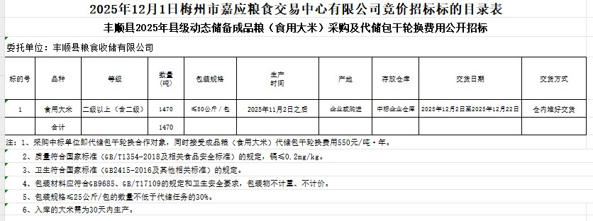 豐順縣2025年縣級動態(tài)儲備成品糧(食用大米)采購及代儲包干輪換費用公開招標(biāo)公告
